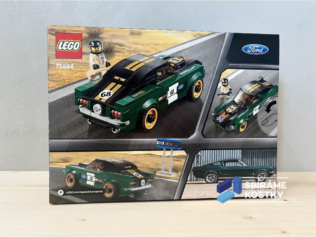 Model kopíruje klasický styl Mustang Fastback z roku 1968 v závodních barvách. Zelená, černá a zlatá doplňují nálepky s grafikou a průhledná světla, které podtrhují autentické detaily pro vystavení i hru.